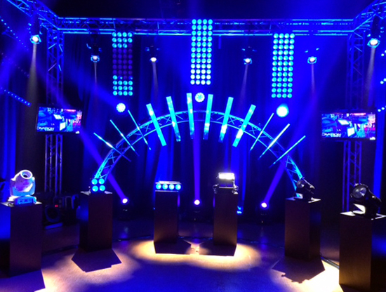 Powered by seven 70-watt quad-color RGBW LEDs, the COLORado 1-Quad IP provides extremely smooth color mixing and brightness, featuring an 11.5° beam angle and 25° field angle. Laine mounted a total of 10 COLORado 1-Quad IP units on the top of the wall, spacing the center 8 units evenly at 36 inches and extending the peripheral units 44 inches out.