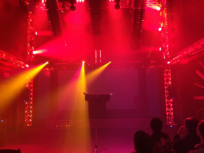 Wilkinson’s lighting rig included four Rogue R1 Spot fixtures, four COLORdash Batten-Quad 6 linear fixtures, 16 Q-Wash 560Z-LED moving washes and two Q-Spot 460-LED moving spots from CHAUVET Professional. The Q-Wash 560Z fixtures were flown in the corners of the ballroom for the “Zumba Party” atmosphere, whilst the Q-Spot 460 spots and COLORdash Battens were used to bring a dynamic backdrop to the stage. The Rogue R1 Spots served as stage and audience lighting.