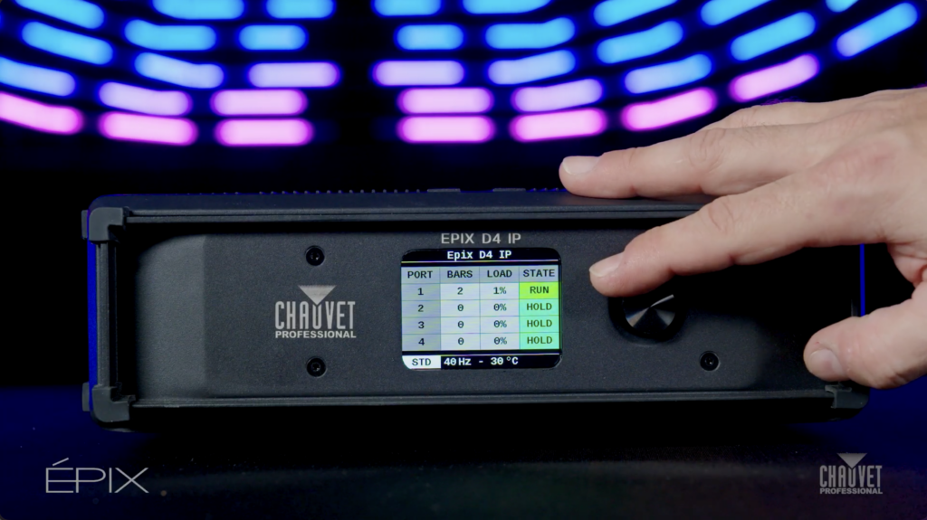 The most noticeable upgrade is the new full-color display paired with a rotary encoder. This streamlined interface makes it easy to navigate settings, view port modes, monitor capacity, and check connected fixtures at a glance. Built-in discovery automatically detects fixtures across all ports and sets power mode, saving valuable setup time.