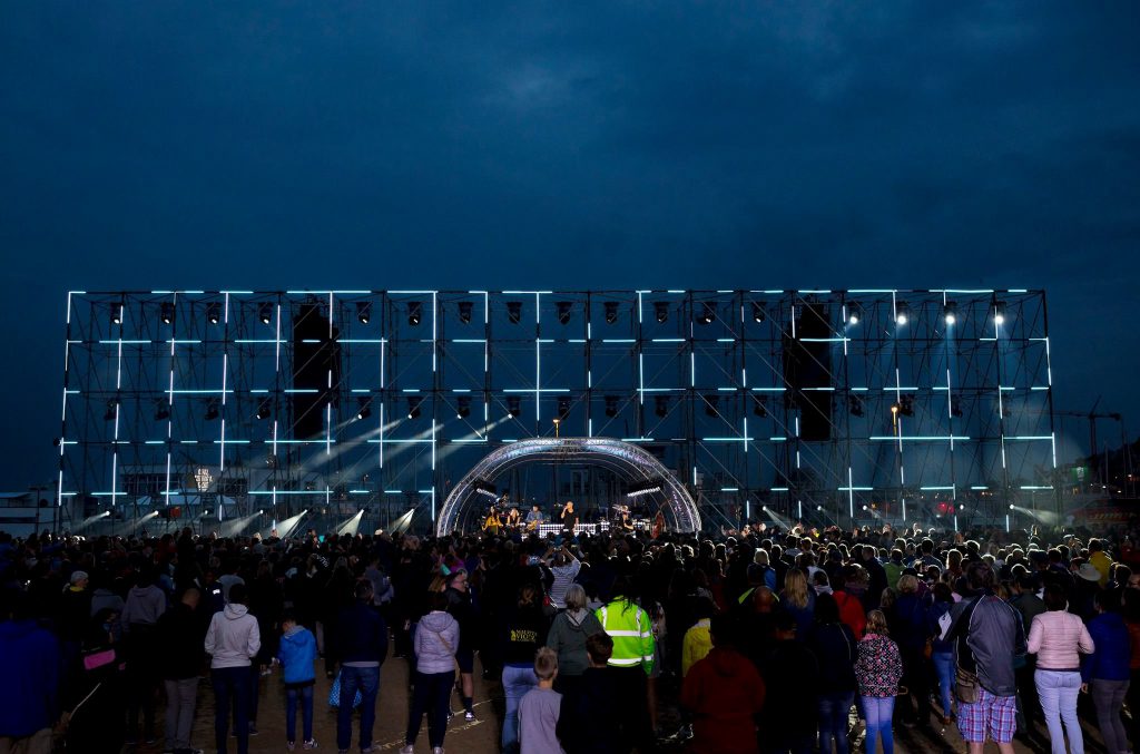 A collection of 410 pixel mapped ÉPIX Strip IP fixtures, supplied by Phlippo Productions, stirred up summer excitement at Belgium’s largest beach festival “2 Meisjes op het Strand.” Ranked among the most popular events in Northern Europe, the festival is known for more than just music. Also drawing thousands of fans and attracting a large national TV audience on Flemish network VTM are the breathtaking harbor vistas at the festival site. At this year’s event, lighting designer Michiel Milbou and his team at Never Fear Shadows did justice to the festival’s music and its surroundings with a stunning stage and lighting design that drew on the brightness and versatility of our ÉPIX Strip IP.