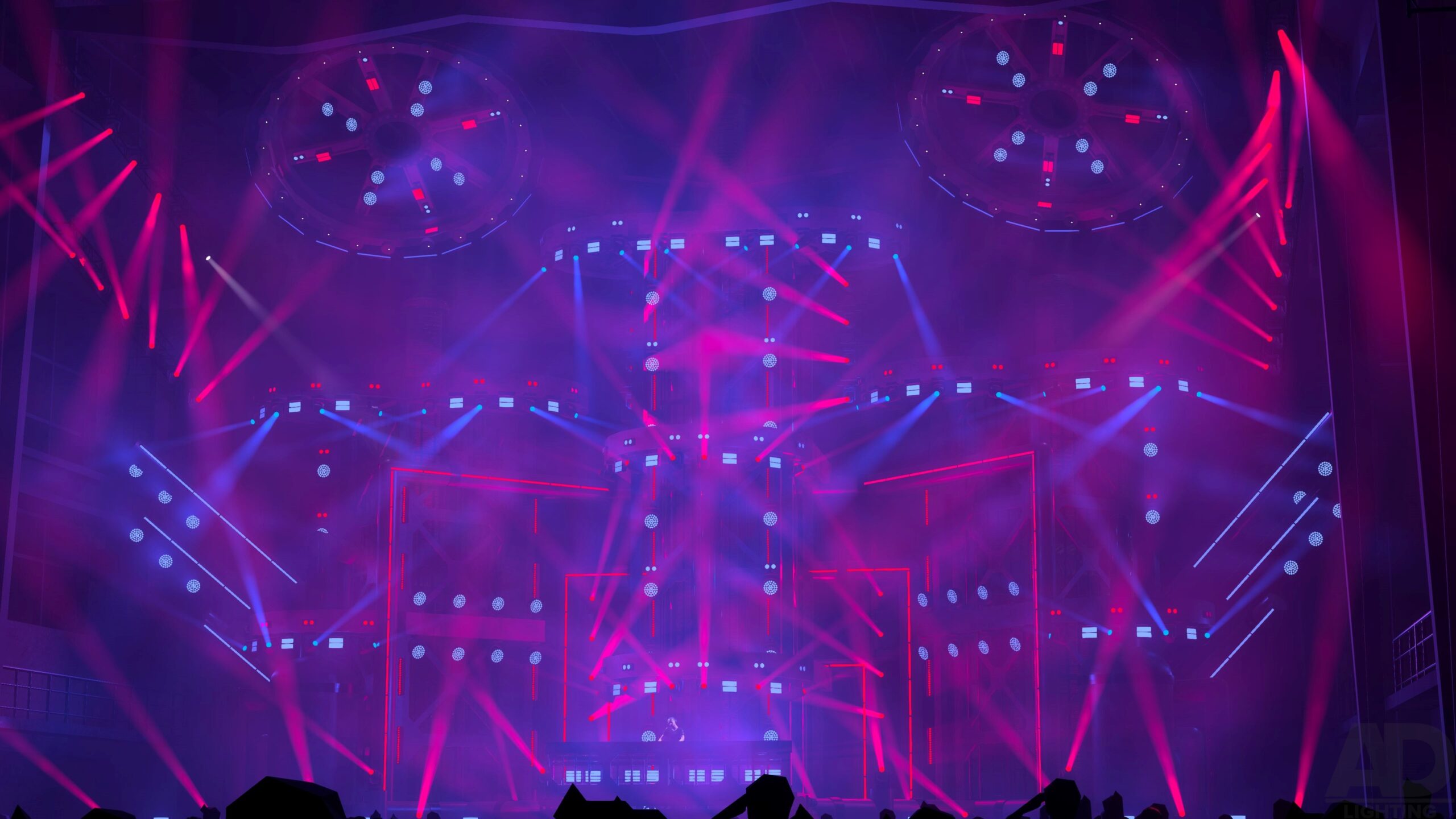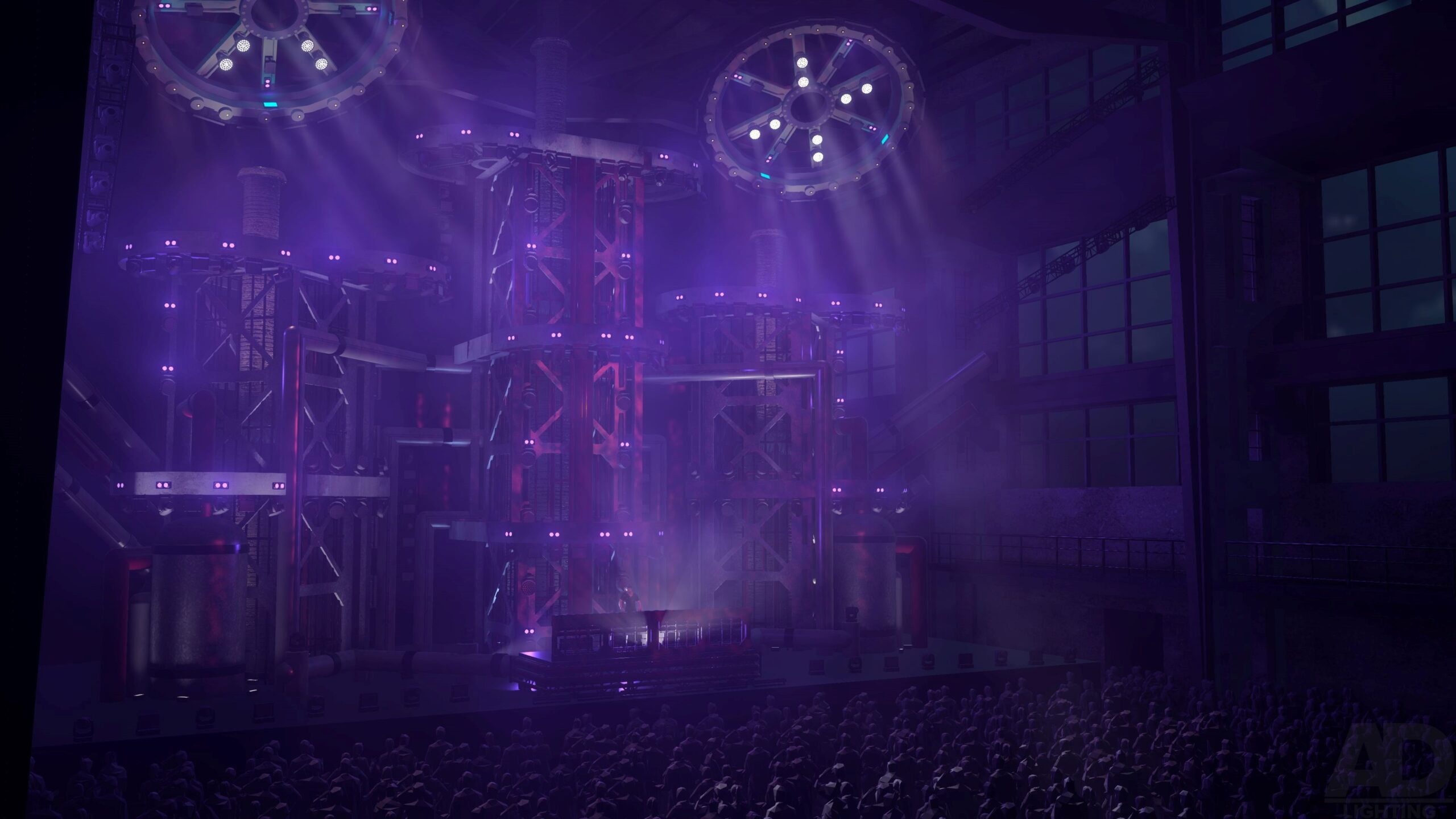 “At the heart of the design are three towering structures that I see as pillars of energy. These are modeled after decaying smokestacks, with the tallest one, positioned behind the DJ, serving as the central focal point. The two outer towers are set at angles and slightly shorter, further adding to the scale of the main structure. The smokestacks are encased in an aged metal framework and have scenic lighting within them so they can stand out on their own during key moments. I wanted to be able to take a “less is more” approach for moments to signify the importance.”