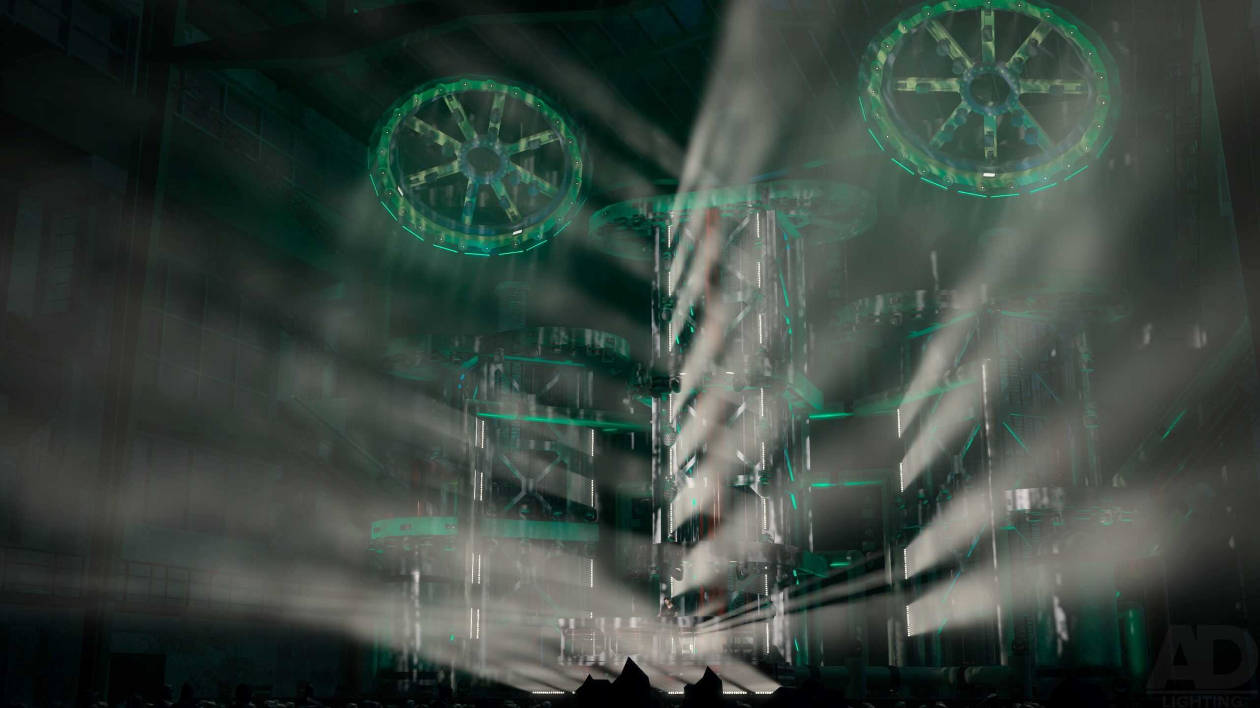 “While this is not based on a specific real nuclear power plant, I took heavy influence from current, and past power plants. I designed the flown set pieces to be based on old turbines, they are flown at angles above the stage to create forced perspective and to represent the energy they once produced. I lined them with various fixtures to highlight the smaller details that might be missed such as all the bolts and gears, as well as to help tie in the big picture of the plant being brought back to life.”