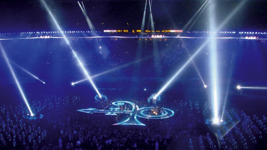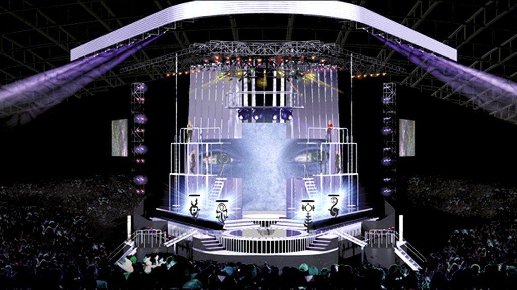 “I was on a flight home after that show sitting in front with a bunch of people from ESPN and I overheard more than one whispered comment that we added Purple Rain as the finale song at the last minute due to the rain storm that night. Not true. That was my first Super Bowl Halftime Show, so I have vivid memories of that experience. From the initial sketches I wanted to open up the vista between Prince and the stadium audience to show the TV audience the connection I knew Prince would achieve. Don Mischer directed that show and we were able to connect the TV audience to that experience for that very reason. It wasn’t a TV shoot…it was a live experience that transcended to the TV audience. Design-wise, the only thing between Prince and the audience were massive spot light beams that I sketched in my concept presentation. I wanted to use beams as the scenery. I didn’t know those beams would create a twinkling misty atmosphere like it did in our rainy performance, but it happened, and I love to look at photos of that show with Prince in the midst of that kind of starry magical place. Fitting for such a singular artist as Prince.”