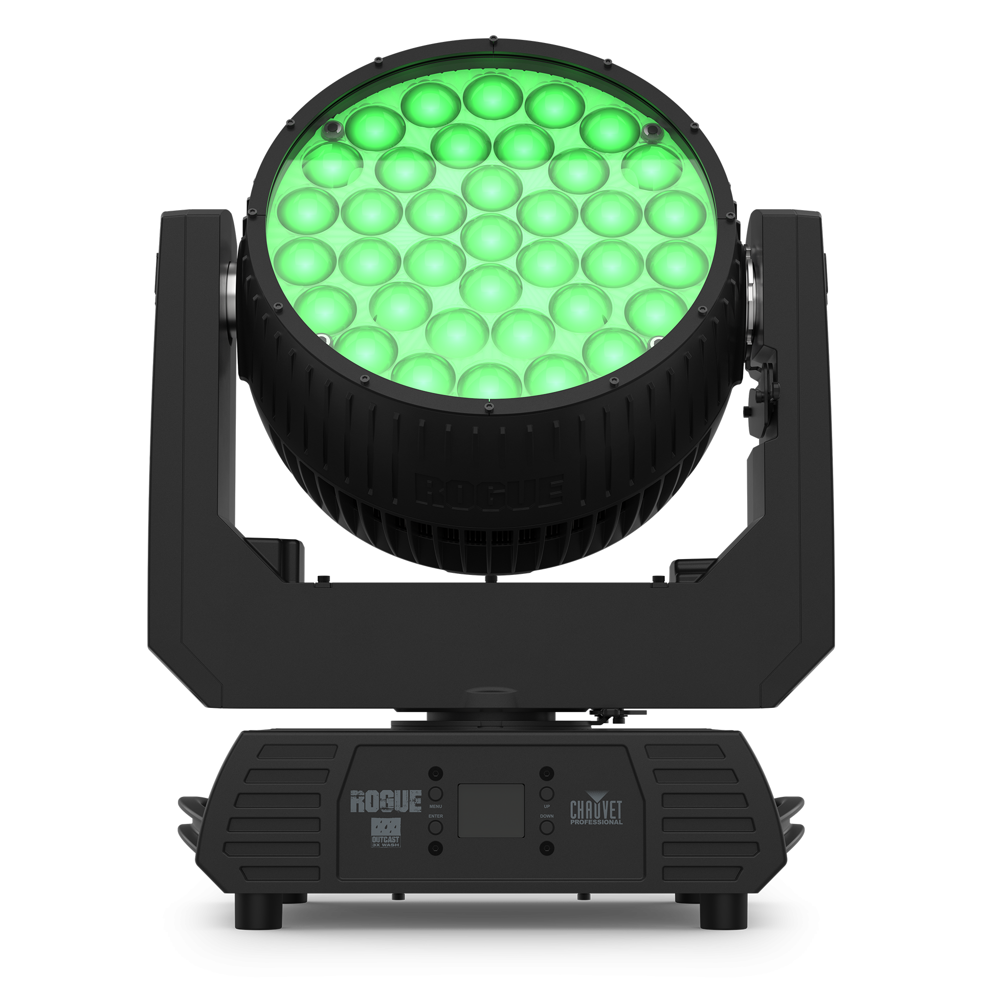 Anyone wishing to rev up the intensity level at live music venues and festivals will want to check out another newcomer at the show: The Rogue Outcast 3X Wash, which allows a fast zoom from beam to wash. Powered by 37 bright 25W RGBW LEDs, this alloy armored IP65 rated fixture can punch through fog or haze. Power stands shoulder to shoulder with flexibility in this versatile wash, which features nine pixel-mappable zones and produces excellent color blending and fades with 16-bit master and individual dimming.