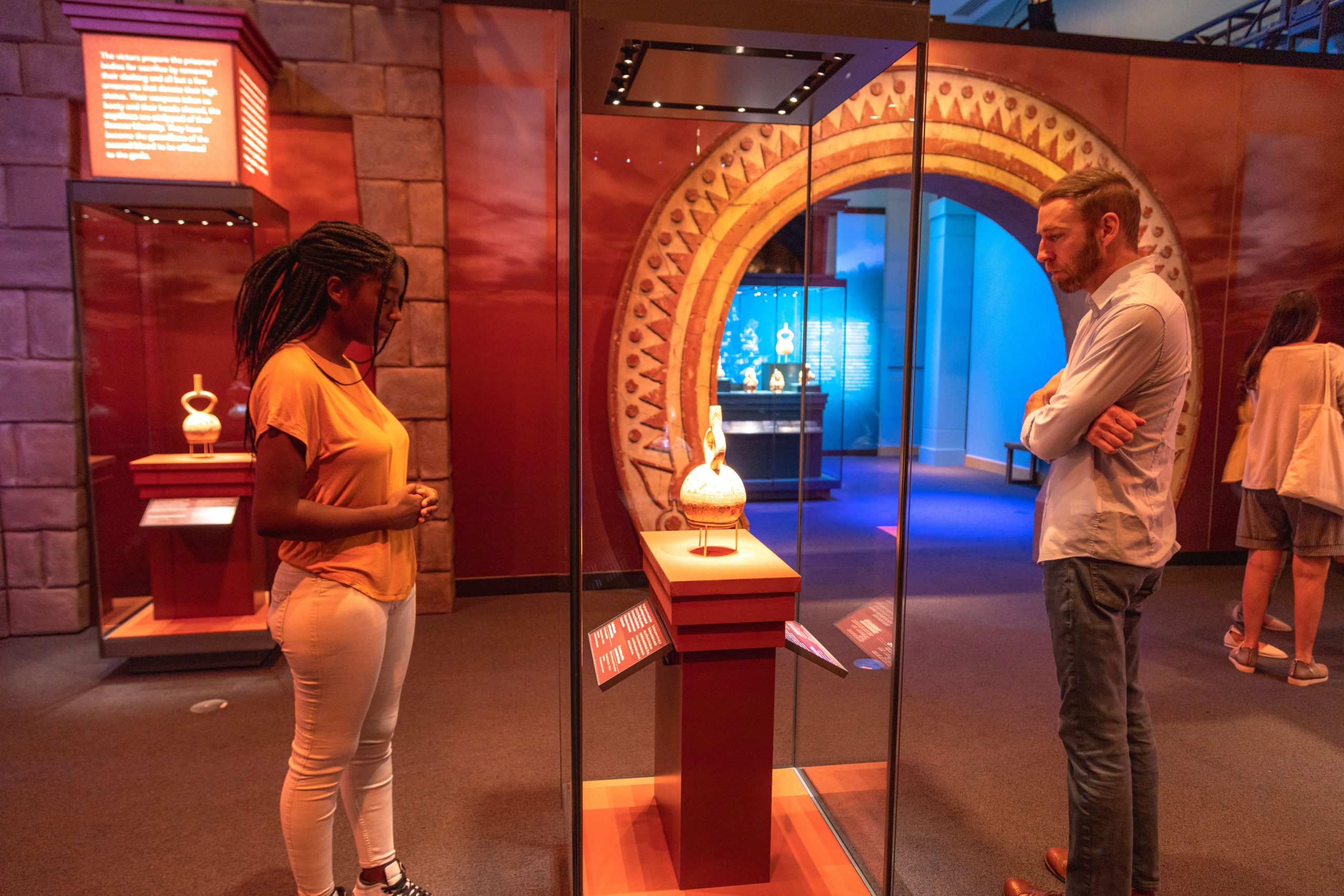Another example can be seen in Gallery 8, which displays ornamental pieces worn by the Incas. These artifacts are arranged on translucent panels in positions that correlate to where they would be worn on the human body. Lighting is used to create silhouettes behind the panels to give the display a haunting human-like quality.