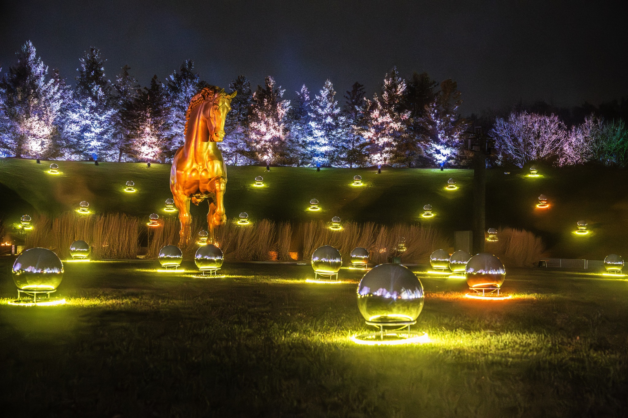 The Lightswitch team channels its own artistic vision crafting light to draw out the essence of each work of art. This is evident everywhere at ENLIGHTEN, including The American Horse. Up lit in soft amber tones and surrounded by boldly colored trees, the 24-foot trotting bronze horse seems to come alive in the light, infused with the passion handed down from Leonardo… to Nina Akamu… to visitors walking through the garden on cold Michigan nights — a very good holiday gift indeed!