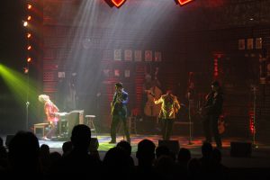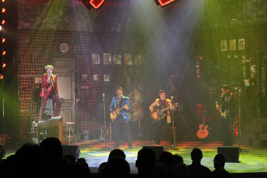 MANCHESTER, NH – The value of one million dollars in 1956 is equivalent to over 899 million today. However, even that lofty figure doesn’t come close to doing justice to the success of the four superstars who are the subject of Million Dollar Quartet. The Tony Award nominated musical takes audiences back to December 4, 1956, a day when budding stars Jerry Lee Lewis, Carl Perkins, Johnny Cash and Elvis Presley got together for a jam session at Sun Records Memphis studio. A recent revival of the musical at the Palace Theatre in Manchester, New Hampshire captures the magic of that long ago moment, thanks in part to a transformative lightshow designed by Carl Rajotte, who also served as artistic director and choreographer.