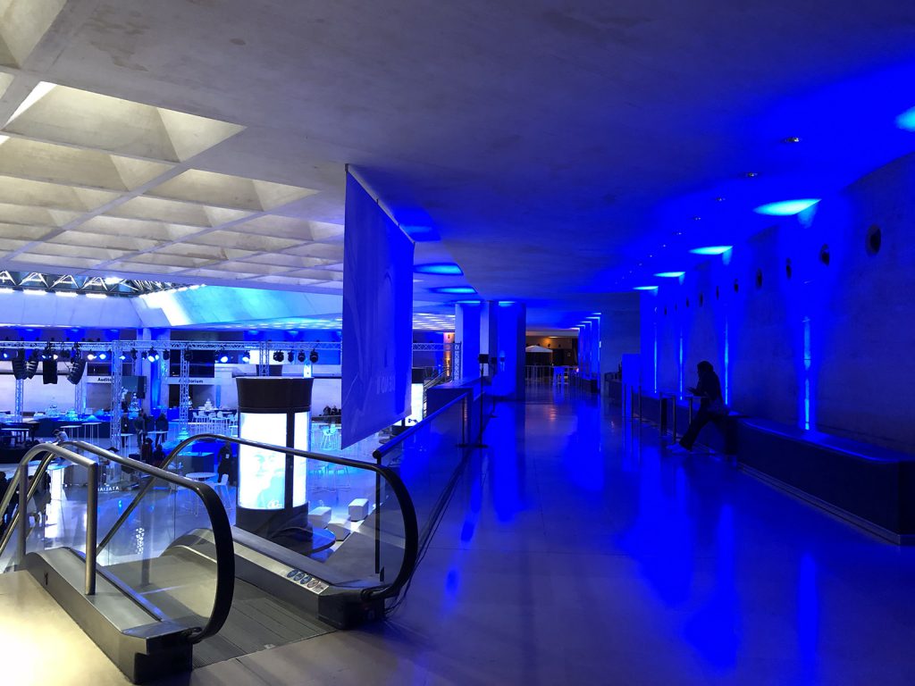 Despite the short setup time, guests who arrived at the event (a 60th anniversary celebration for the DEF Network group of fire prevention companies) were treated to a stunning and stylishly designed setting for their gala. This was evident to them as soon as they entered the reception area via a spiral staircase and encountered a vista of richly saturated blue light from 90 WELL Fit fixtures.