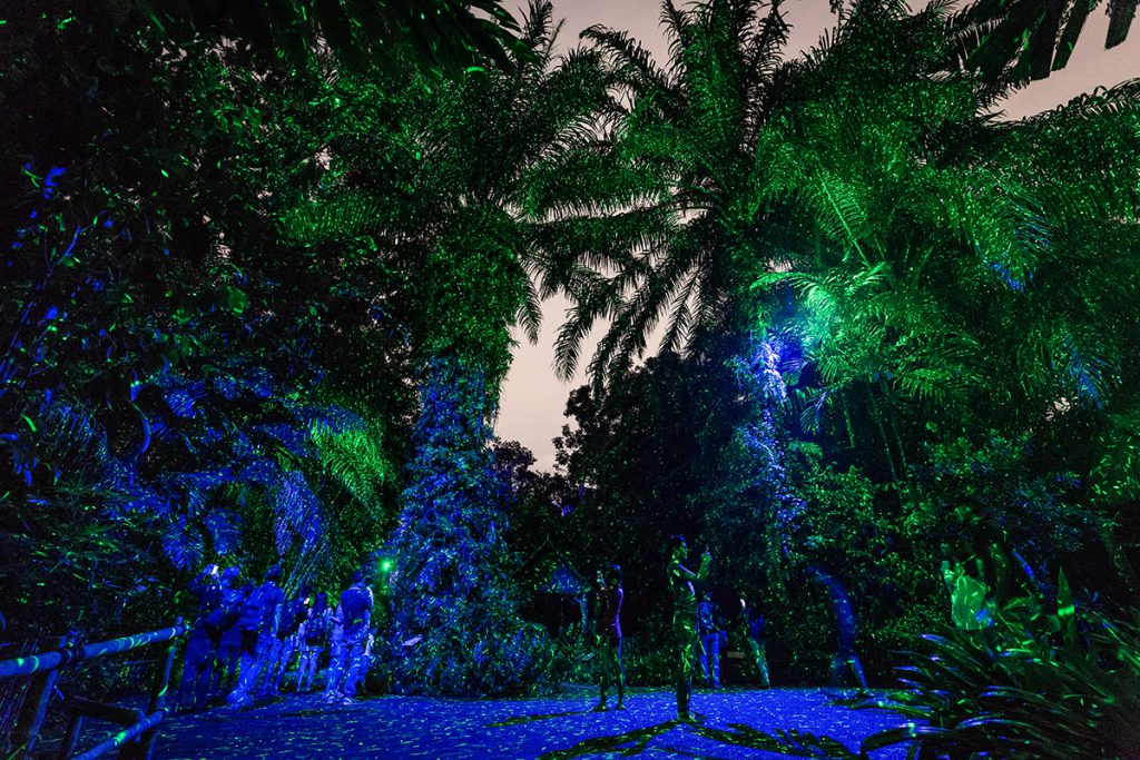 Setting an alluring tone for visitors as soon as they approach Rainforest Lumina is the vividly colored UV lighting at its entrance. This is one of two zones on the Night Walk colorized with UV light. The other is an area covered with woody tropical climbing plants. A collection of 20 COLORdash Par H7IP and six COLORdash Par H12IP fixtures is used to light both locations.