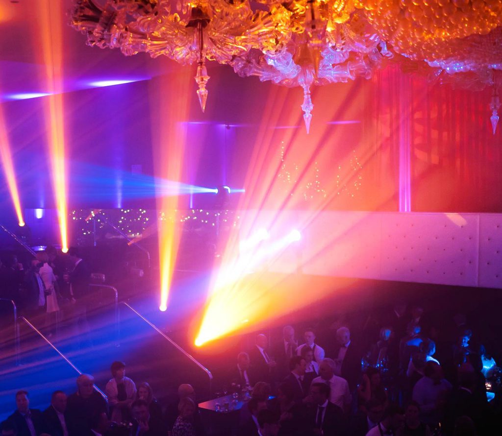 As the event unfolded and the dancing began, the moving fixtures morphed from being mood setters to disco lights. Turning the Rogues from the chandelier and grand stairway, the designers directed a dynamic pattern of crisscrossing colorful light onto the dancefloor, creating looks worthy of an EDM club. “Lighting helped us change the entire flavor of the room,” said D’Hulster.