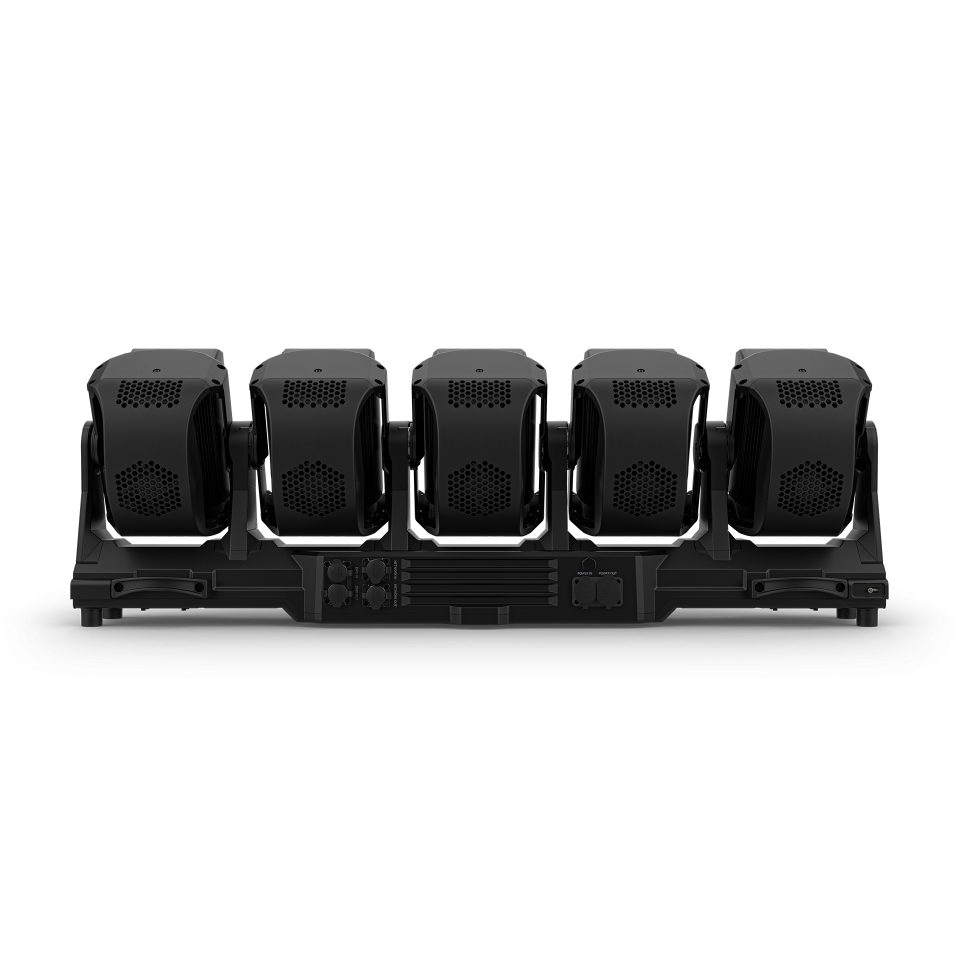 Fully featured IP65 rated Bar style fixture with (5) heads, each consisting of single (120W) RGBW LEDs, and two linear four cell CW and WW Strobe LEDs