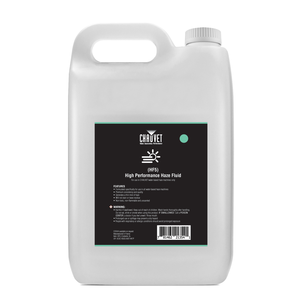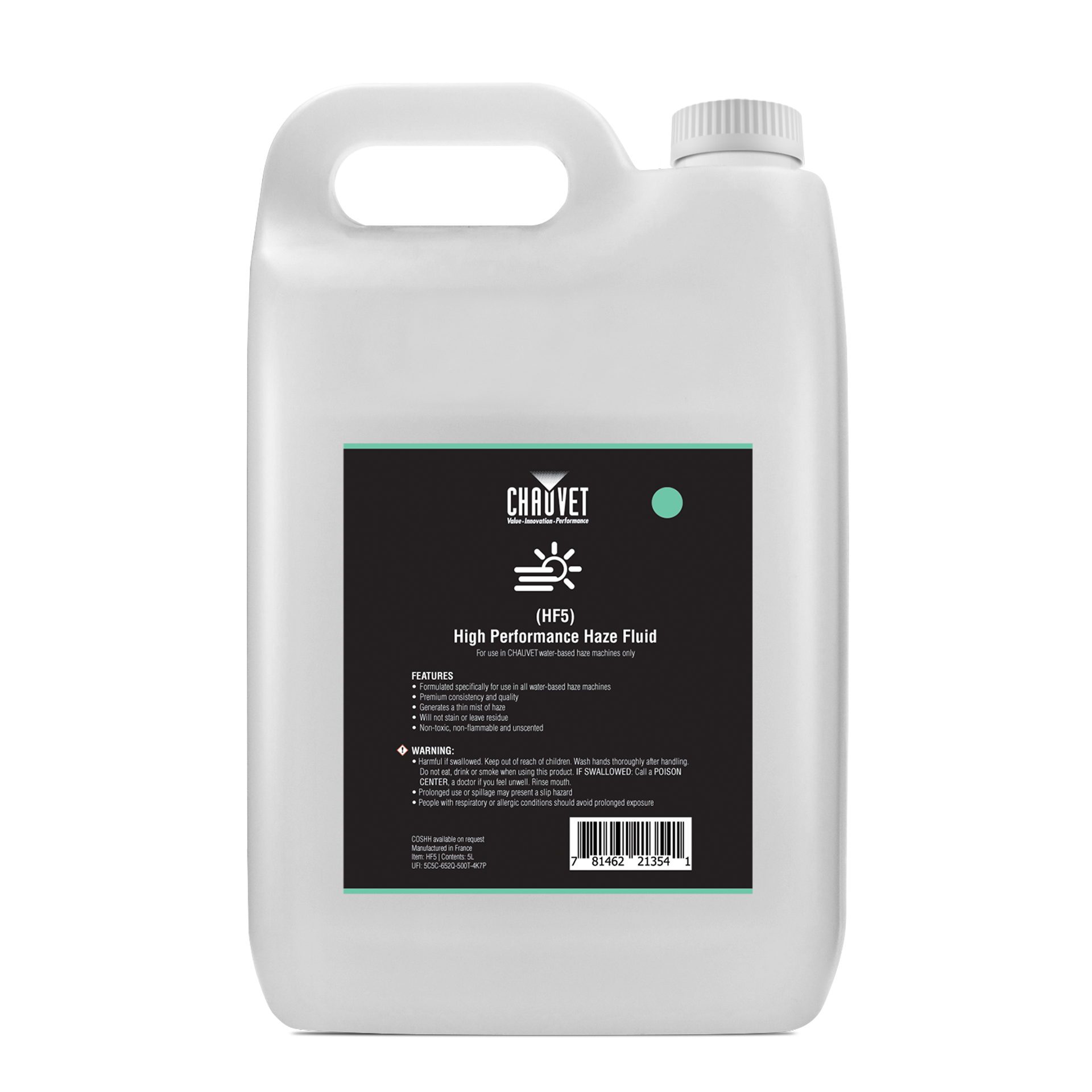 CHAUVET High Performance Haze Fluid HF5 is a nontoxic, nonflammable, and unscented formula that generates a thin mist of haze without staining or leaving behind residue.