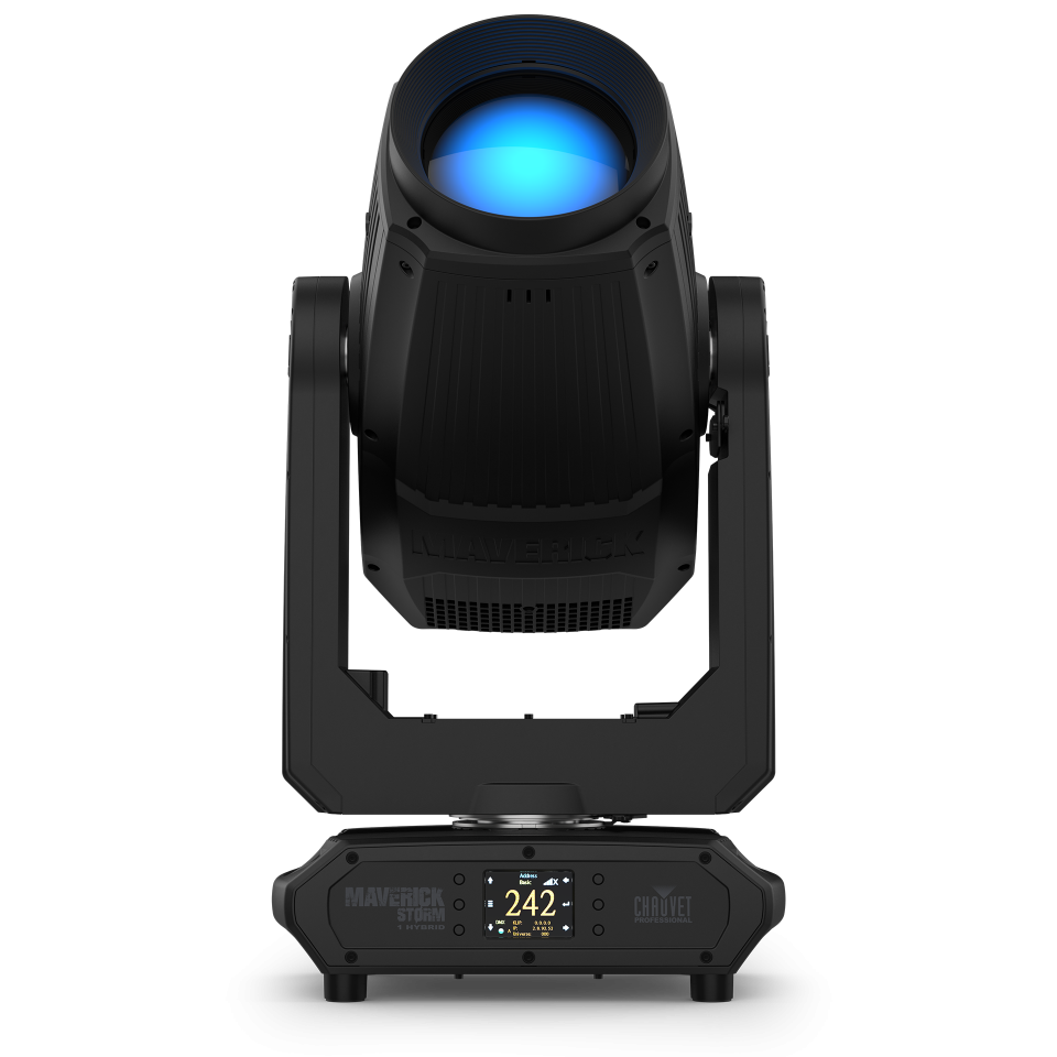 The Maverick Storm 1 Hybrid is a versatile all-in-one lighting fixture for large-scale events. It combines three functions: a ‘Beam’ for sharp, narrow shafts of light; a ‘Spot’ for projecting crisp patterns or logos; and a ‘Wash’ for bathing large areas in a wide, soft field of color. Its powerful output makes it ideal for concerts, festivals, and stadium shows.