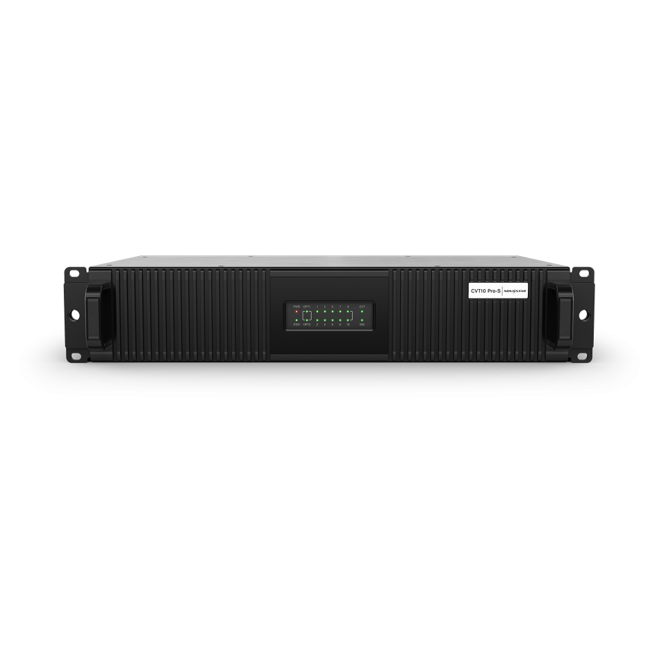 Setting up the CVT-10 Pro is designed to be straightforward. It can be easily mounted in a standard equipment rack or attached directly to a stage truss. You simply connect the main fiber optic cable from your video source to its input, and it provides ten standard network outputs to run cables to different sections of your LED wall, making signal distribution simple and organized.