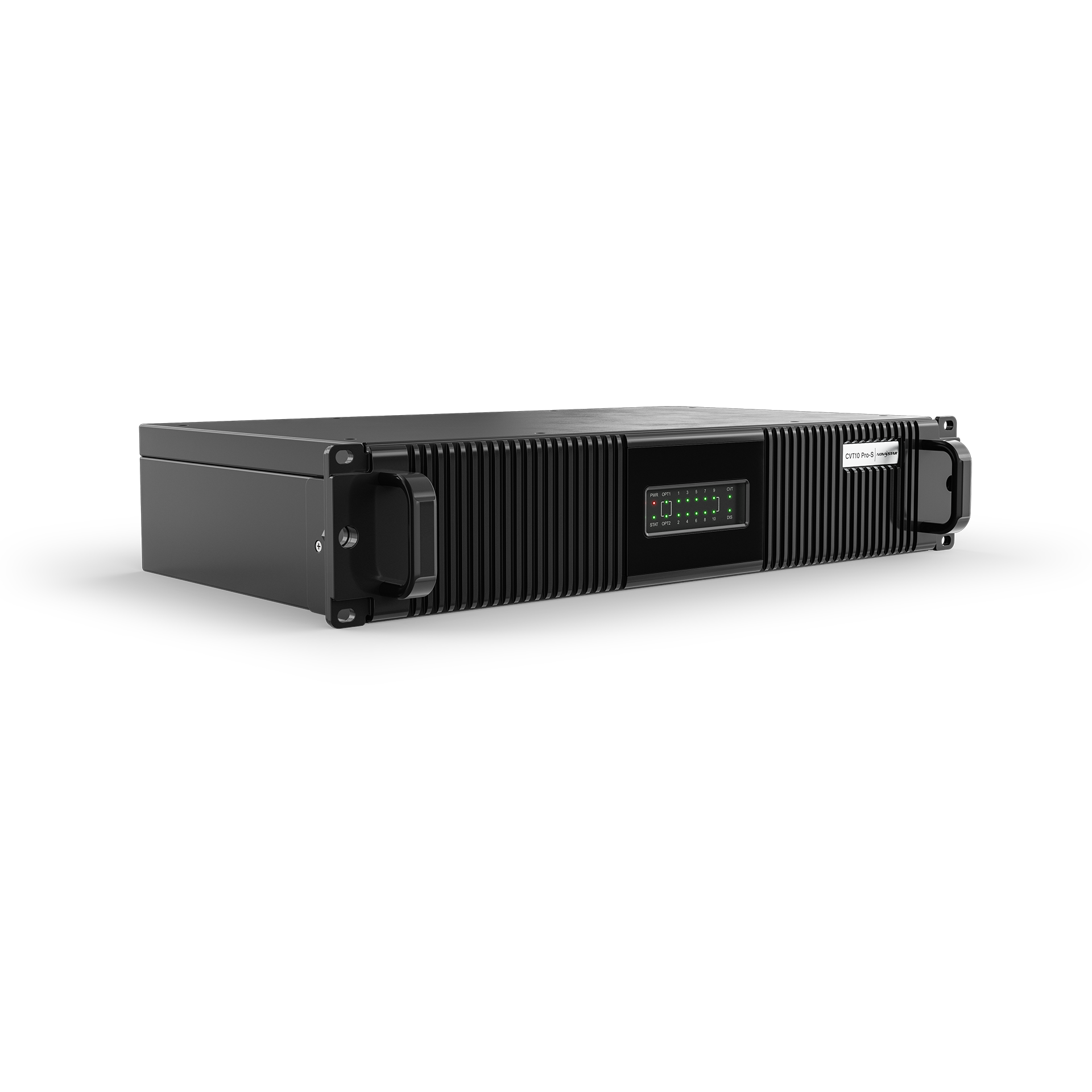 NovaStar CVT10 Pro EO Converter is a rugged IP65-rated single-mode fiber converter that works with all NovaStar processors and supports 10x Gigabit Ethernet ports when used with the NovaStar MX40 Pro LED display controller. Full-duplex low-interference data transmission makes this converter suitable for bridging long-distance signal runs. Its outdoor-rated 19″ 2U design is suited to both truss and rack mounting, making it ideal for event production. Features include 10G optical modules, 1G Ethernet ports and a USB-B control port, along with durable Neutrik PowerCON and etherCON connectors and 2x M10 receivers for truss clamp attachment.