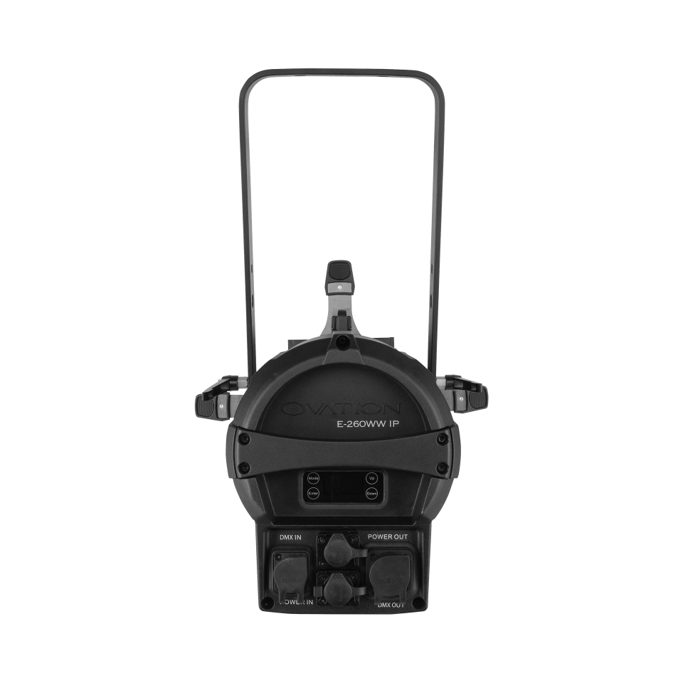 Ovation E-260WW IP takes the brilliant breakthrough concept of the Ovation E-260WW and places it outdoors. Our standard shutter assembly and lenses lend familiarity and ease-of-use to this groundbreaking IP65-rated ERS-style fixture with an output surpassing that of 750 W HPL. This groundbreaking ellipsoidal also boasts extremely smooth dimming down to the very bottom of the curve as well as a flat and even field of light for superior gobo projection. Selectable PWM, RDM, and onboard dimming curves ease setup and programming.