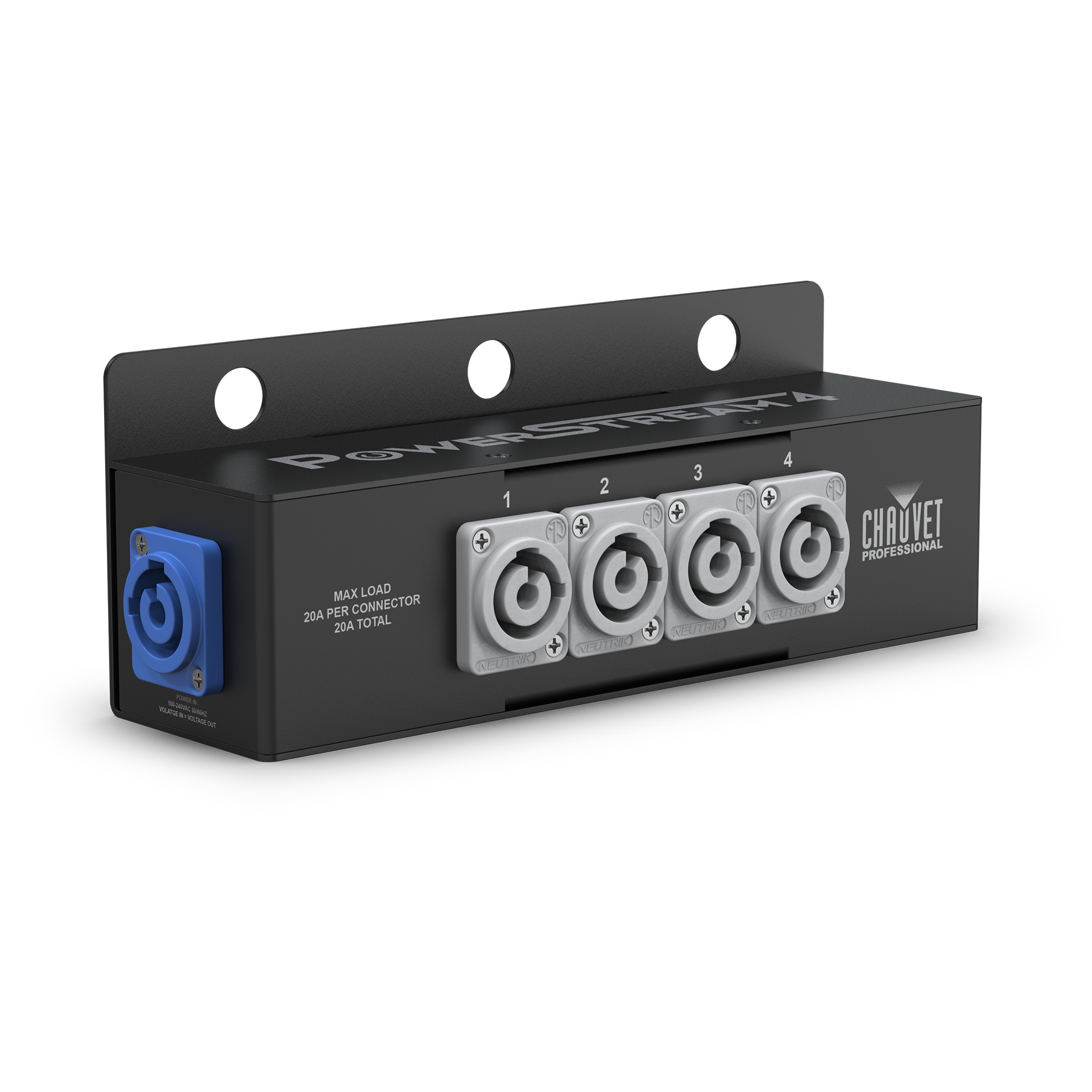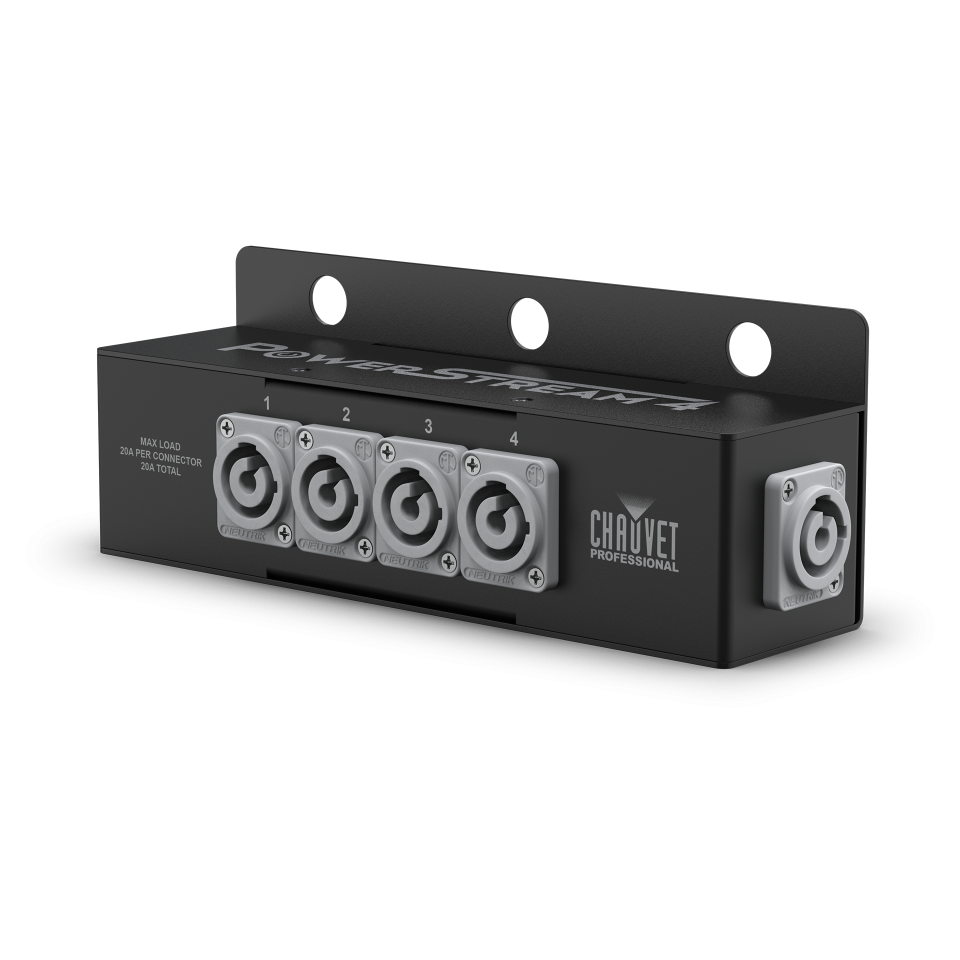 The PowerStream 4 is a compact power distribution box that turns a single power cable into five separate outputs. It’s designed to be attached to a lighting truss to neatly provide power to multiple fixtures, which simplifies cable management and speeds up event setup.