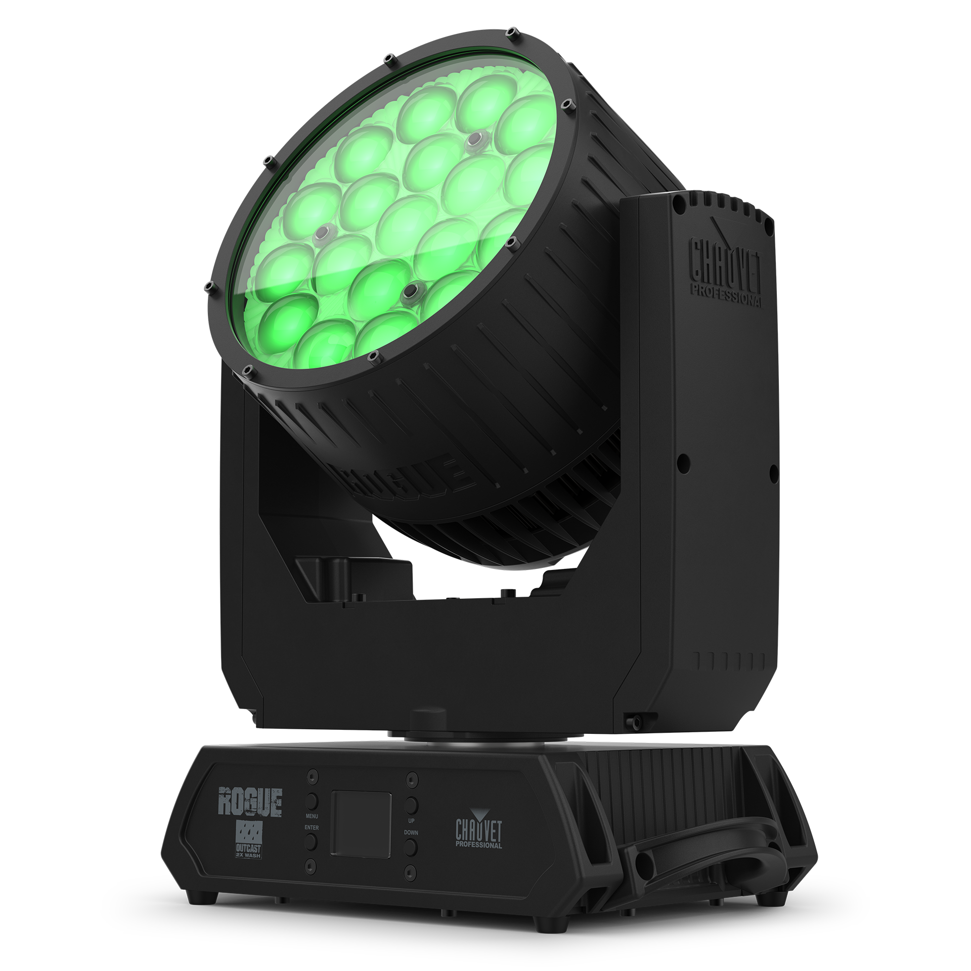 Rogue Outcast 2X Wash is a lightweight IP65 wash that goes wide and hangs anywhere, with a wide zoom range of 8° to 66°, wide 2800 to 10000 K color temp range, wide selection of simple to complex DMX personalities, and a durable alloy housing that suits this versatile workhorse to the widest range of both indoor and outdoor applications, including on-camera use with its user selectable calibrated white. 19 bright 25W RGBW quad-LEDs occupy 5 pixel-mappable zones and produce excellent color blending and fades with 16-bit master and individual dimming.