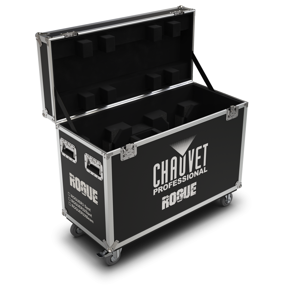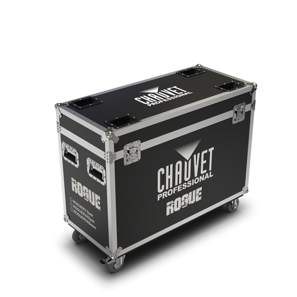 A durable, custom-built road case designed to securely house and transport two Rogue R2X Spot or Rogue R3 Spot fixtures.