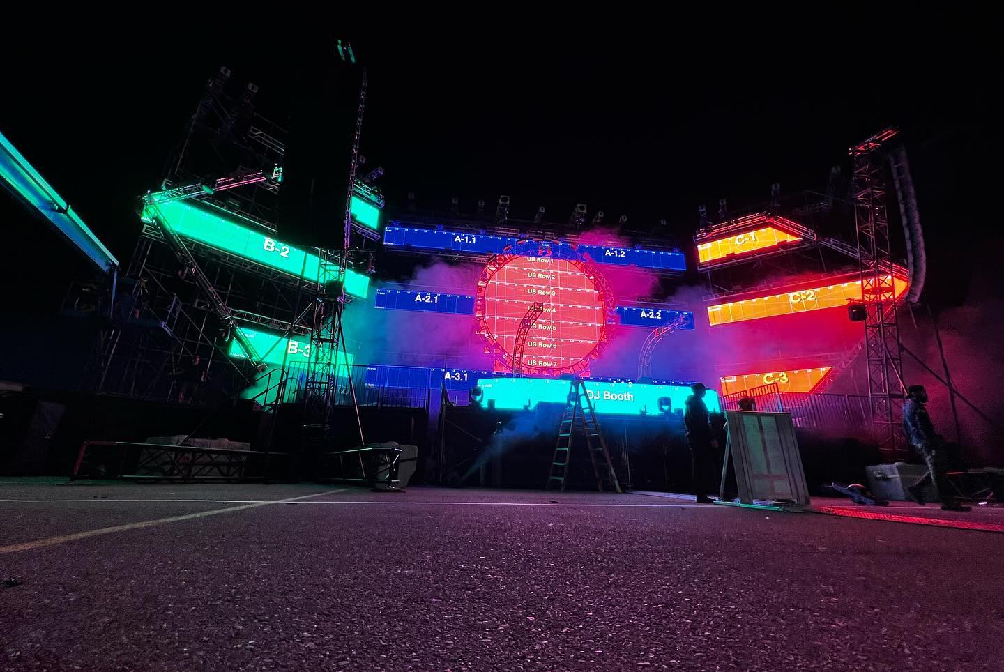 “We first built the center top three horizontal lines of truss, trimmed it out. Once that was done, we moved on the building the circle and taking up to trim. From there we build the next two rows of lights that surrounded the circle. Once that was done the bottom row of lights was a ground stacked truss structure. On the sides it was a very similar process.”