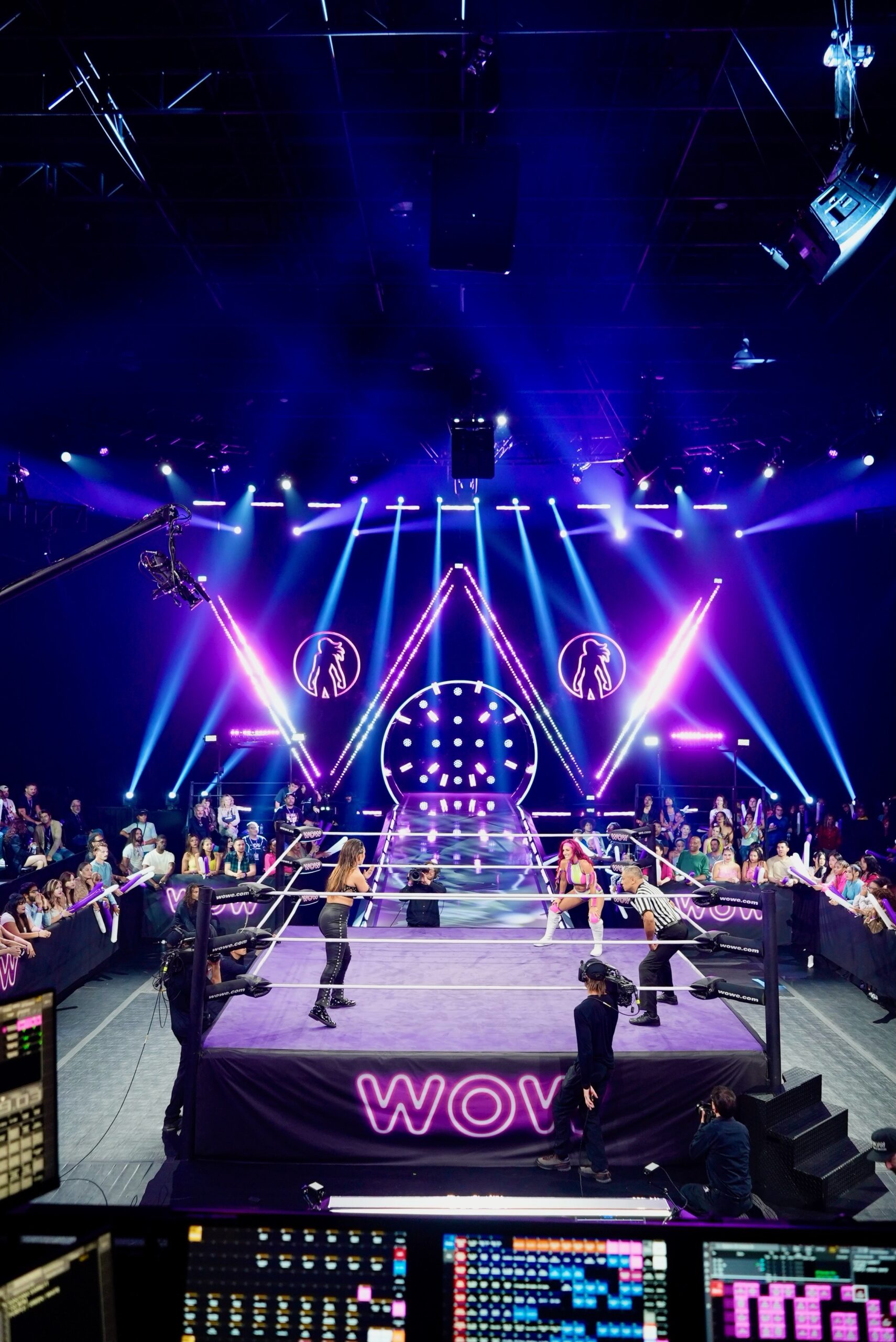 LOS ANGELES – It’s no wonder that the wildly popular WOW – Women Of Wrestling TV series’ acronym is also those three simple letters: W O W. This branding theme is there for all to see in the current season of the series, as the two Ws, from this powerfully evocative expression are spelled out in light by 64 CHAUVET Professional COLORado PXL Curve 12 motorized battens supplied by Felix Lighting.