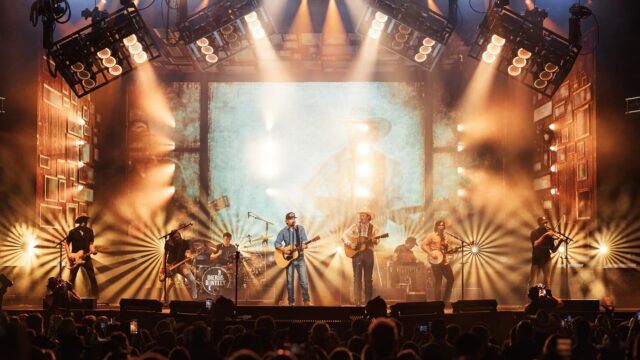 The bright RGBAW linear fixtures are arranged in two layers of semi circles behind the band and in vertical stacks between video panels. From these positions, they backlight the the performers, separating them from the upstage area. This seems to bring the band closer to the audience. At the same time, the straightforward geometric configuration of the bright, colorful battens draws the crowd’s attention to the stage bringing them closer to the band.