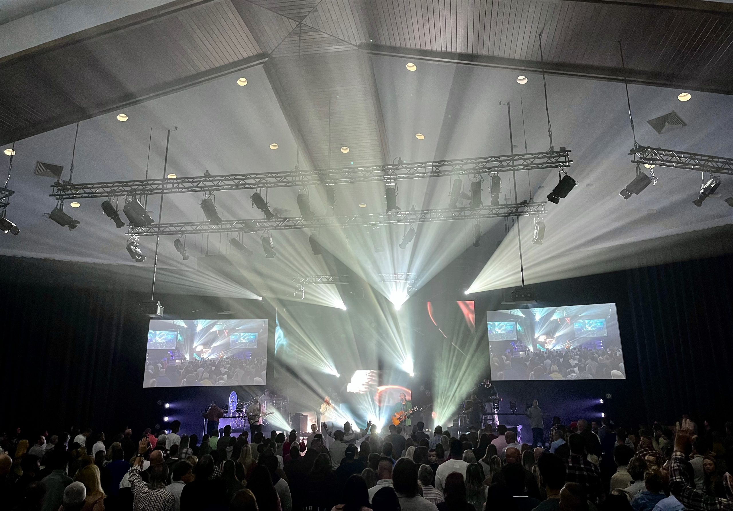 Positioned on the stage deck, next to the drum and keyboard risers, the Rogue RH1 Hybrids in the church’s rig (between two and six depending on the service or event) are used to accent key moments on stage and to engage worshippers by directing crisp tight beams across the room.
