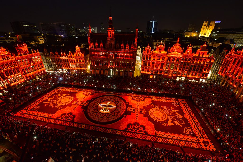 BRUSSELS – Once every two years, Brussels’ Grand Place, arguably the most beautiful town square in Europe, becomes even more breathtaking as its cobblestone surface is transformed into a magnificent carpet of color by over a half million flowers. Artfully arranged in an intricate design, the floral panorama flows gracefully, softening the gilded baroque buildings that surround it to create a vista of almost mythical beauty.